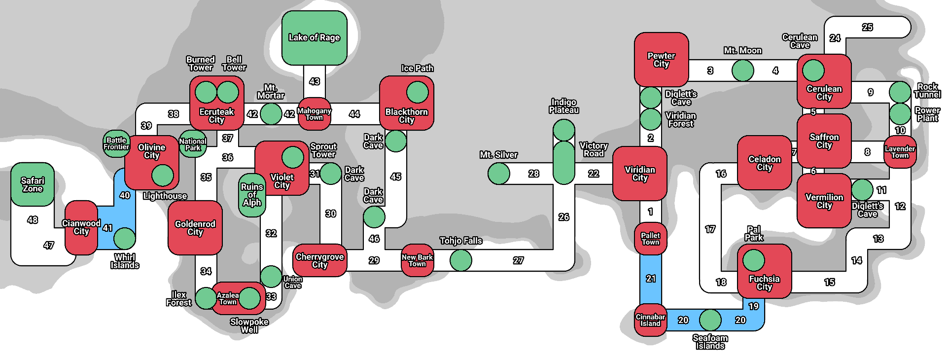 Safari Zone Route 48 (Johto) Route 47 (Johto) Cianwood City Route 41 (Johto) Whirl Islands Route 40 (Johto) Olivine City Battle Frontier Route 39 (Johto) Route 38 (Johto) Ecruteak City Burned Tower Bell Tower Route 37 (Johto) Route 36 (Johto) Route 35 (Johto) National park Goldenrod City Lighthouse Route 34 (Johto) Ilex forest Azalea Town Slowpoke Well Route 33 (Johto) Union Cave Route 32 (Johto) Ruins of Alph Violet City Sprout Tower Route 31 (Johto) Dark Cave Route 30 (Johto) Cherrygrove City Route 29 (Johto) New Bark Town Route 27 (Kanto) Route 26 (Kanto) Route 46 (Johto) Route 45 (Johto) Tohjo Falls Ice Path Blackthorn City Route 44 (Johto) Mahogani Town Route 42 (Johto) Mt. Mortar Route 43 (Johto) Lake of Rage Victory Road Indigo Plateau Route 28 (Kanto) Mt. Silver Route 22 (Kanto) Viridian Forest Route 1 (Kanto) Route 2 (Kanto) Pallet Town Viridian City Diglett's Cave Pewter City Route 3 (Kanto) Mt. Moon Route 4 (Kanto) Cerulean Cave Cerulean City Route 24 (Kanto) Route 25 (Kanto) Route 9 (Kanto) Rock Tunnel Power Plant Route 10 (Kanto) Lavender Town Route 8 (Kanto) Saffron City Route 5 (Kanto) Route 7 (Kanto) Route 6 (Kanto) Celadon City Route 16 (Kanto) Route 17 (Kanto) Route 18 (Kanto) Pal park Fuchsia City Route 15 (Kanto) Route 14 (Kanto) Route 13 (Kanto) Route 12 (Kanto) Route 11 (Kanto) Route 19 (Kanto) Route 20 (Kanto) Seafoam Islands Cinnabar Island Route 21 (Kanto) Vermilion City